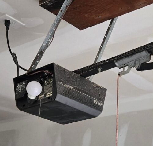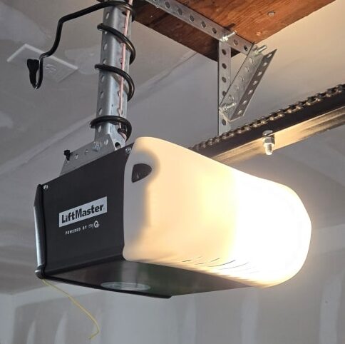 We removed the existing sectional doors and outdated openers, replacing them with two LiftMaster WiFi-enabled chain drive trolley openers, complete with all components for smooth, quiet, and reliable operation. To ensure proper support, new perforated angle brackets were installed to replace damaged steel hangers.