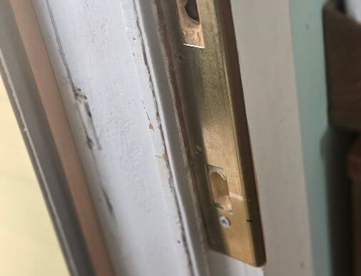 To finish the repair, we installed new trim, secured everything with proper hardware, and painted the repaired area to match the existing trim and framing, likely in gloss white for a seamless look. The original strike plate was then reinstalled, ensuring proper door alignment and functionality.