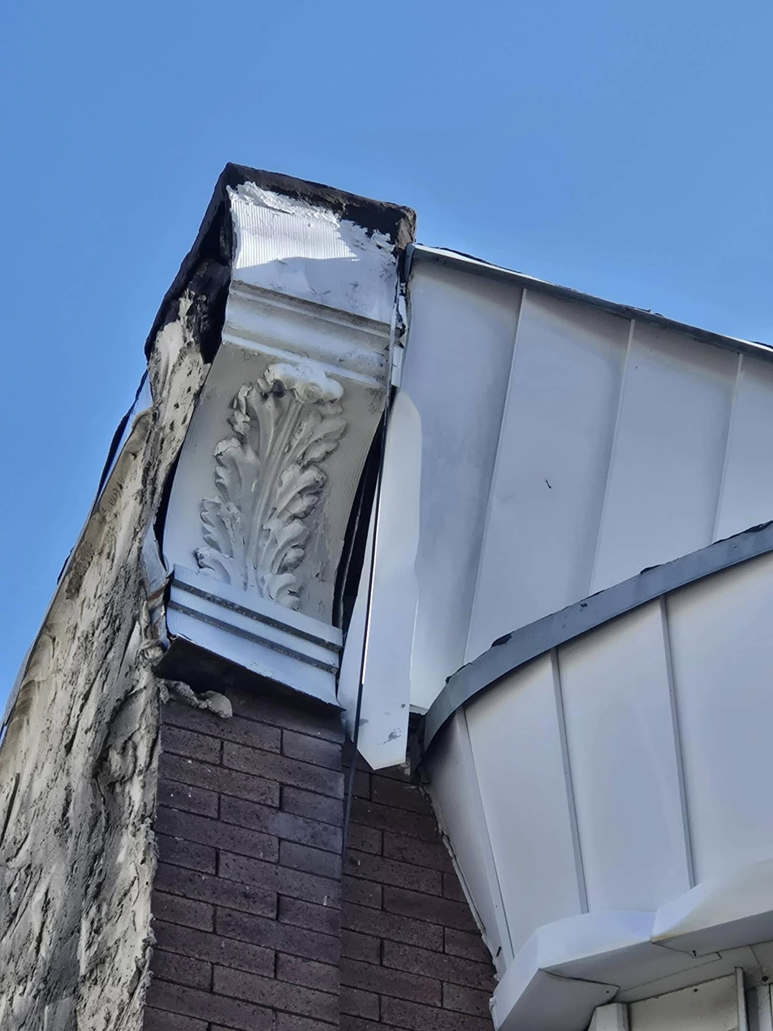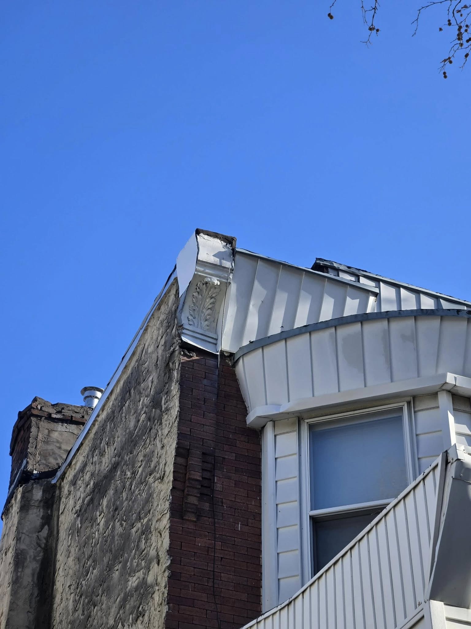 We completed a targeted fascia repair at the corner of the top cornice to restore protection and improve the home’s exterior finish. The existing fascia metal was resecured and replaced where needed, using custom-bent white aluminum capping formed on a brake for a precise fit.