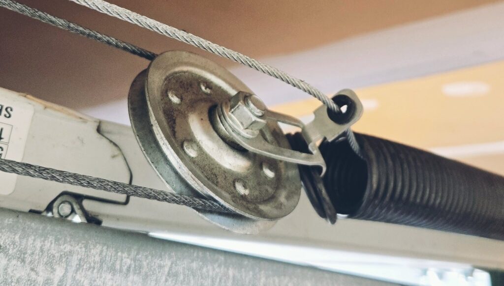 During a routine inspection, this motorized garage door was found hung up in motion with the sheave wheel dislodged, causing the door to go out of level. Our team replaced the sheave wheel and all necessary hardware, restoring proper alignment and smooth operation.