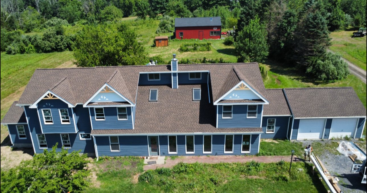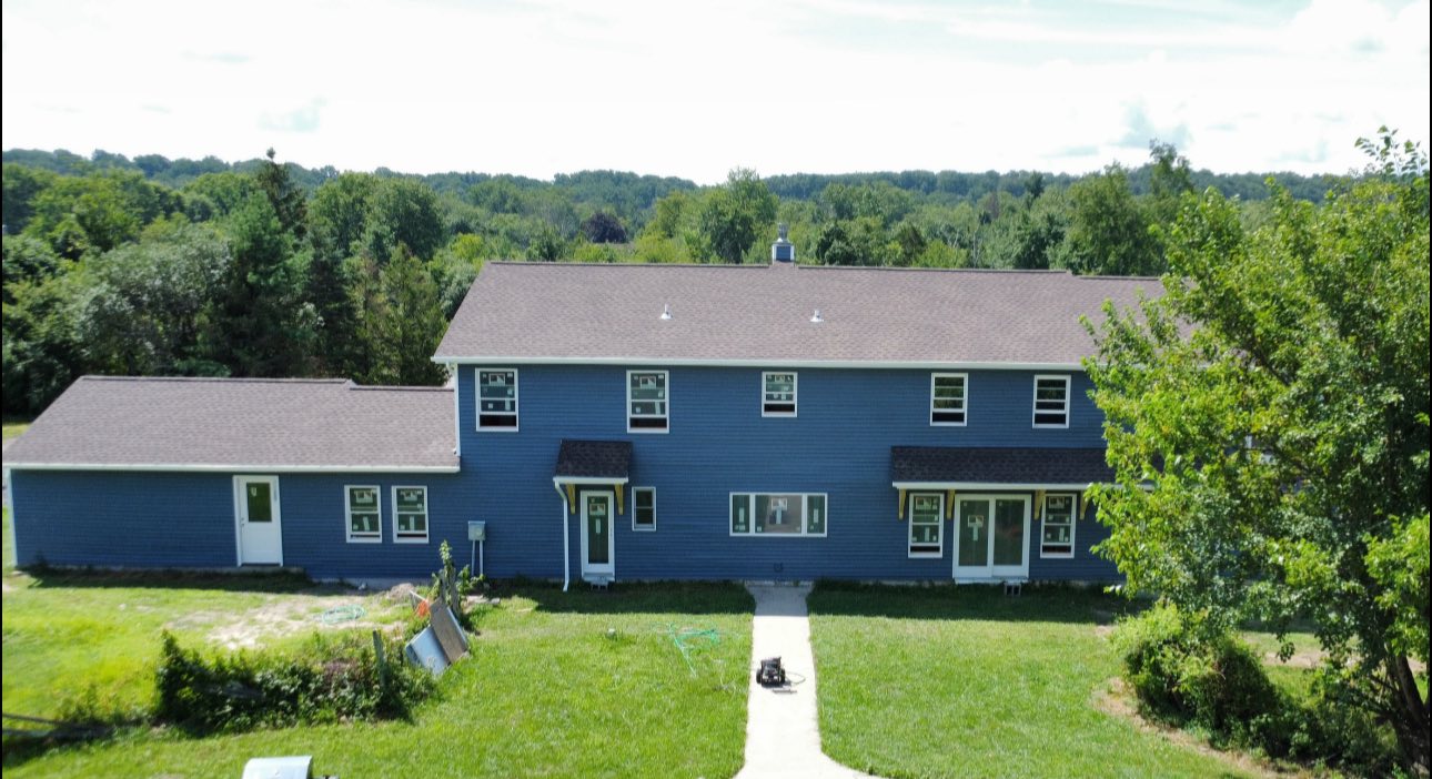 We installed 55 squares of CertainTeed Pacific Blue siding, giving the home a bold, clean look that will hold up beautifully over time. To add texture and character, we added Cedar Impressions on the gables—bringing that classic shake-style charm without the maintenance. Up top, we replaced the roof with 48 squares of GAF Timberline HDZ shingles in the warm Barkwood tone, adding dimension and long-lasting protection.